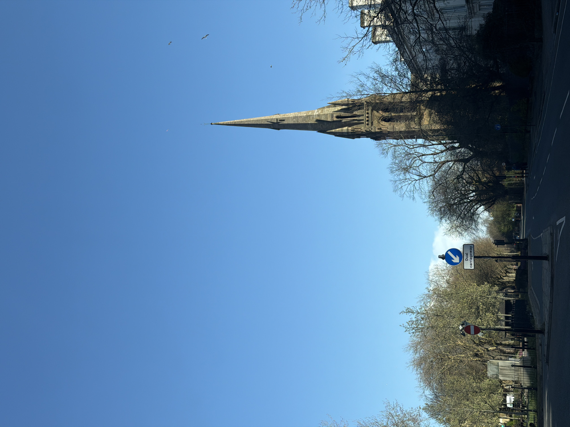 low-angle shot of St. Bride's Church in Liverpool, United Kingdom, featuring its tall, pointed spire against a bright blue sky. Three birds are visible in the sky. The lower portion of the image includes a street with road signs indicating a dual carriageway and a no-entry sign. Trees line the street.