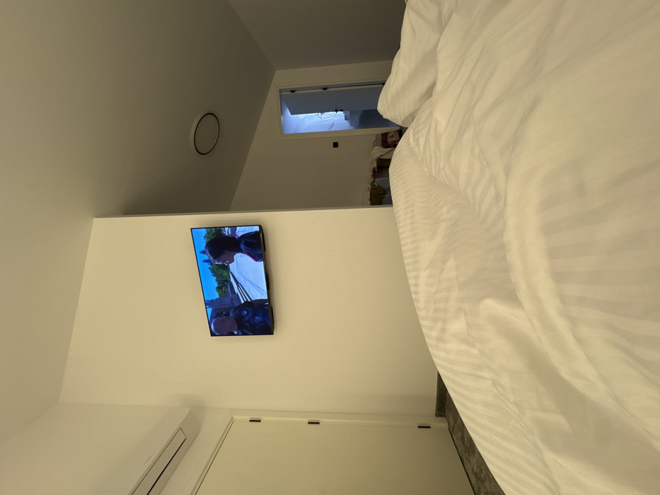 The image displays an interior room, likely a bedroom or hotel room, located in Bania, Bulgaria. The perspective is from a low vantage point, looking across a bed covered with white, horizontally striped bedding that occupies the lower half of the frame. A flat-screen television is mounted on a light-colored wall in the mid-ground, displaying a scene featuring two individuals. On the left, a bald male in a dark shirt faces right, towards a female with dark hair. They appear to be in an outdoor setting with a large stone structure and greenery under a blue sky in the background. To the left of the television, a white wall-mounted air conditioning unit is visible above a white door with two dark hinges. The floor near this door is a grey, textured material. To the right of the television, the room's ceiling slopes upwards, and a circular, recessed light fixture is mounted on it. Further right, an open doorway reveals an adjacent room, from which bright artificial light emanates, illuminating a white fixture, possibly a toilet or sink. Several indistinct items are visible on the floor near the threshold of this doorway.