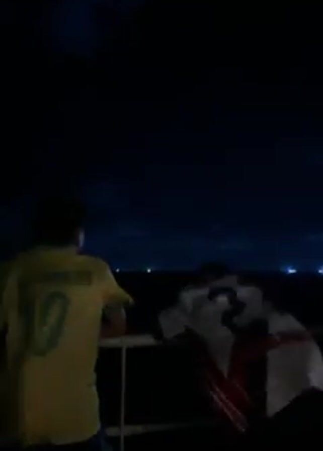 Two people stand on the deck of a ship at night. One person wears a yellow Brazil soccer jersey with the number 10 and the name "NEYMAR JR" on the back. The other person wears a white shirt with red stripes and the words "RIVER PLATE IS HERE". They both look out at the distant lights of a city across the water. The night sky is dark with some clouds. The ship has a white railing.