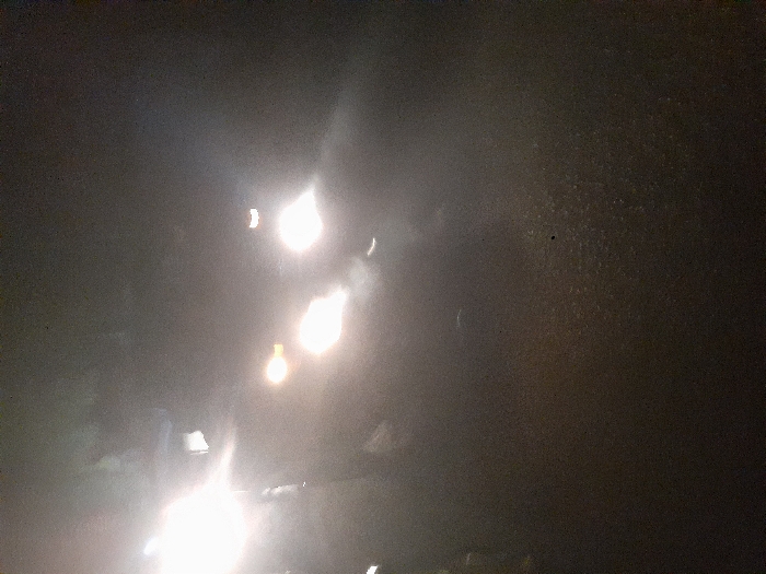 A dark, blurred image reveals several bright lights, vertically aligned. The lights appear hazy and diffused, suggesting a foggy or unclear atmosphere. The overall setting seems dark, with the lights serving as the only visible elements. The image quality is poor, making it difficult to discern any specific details beyond the presence of these lights.