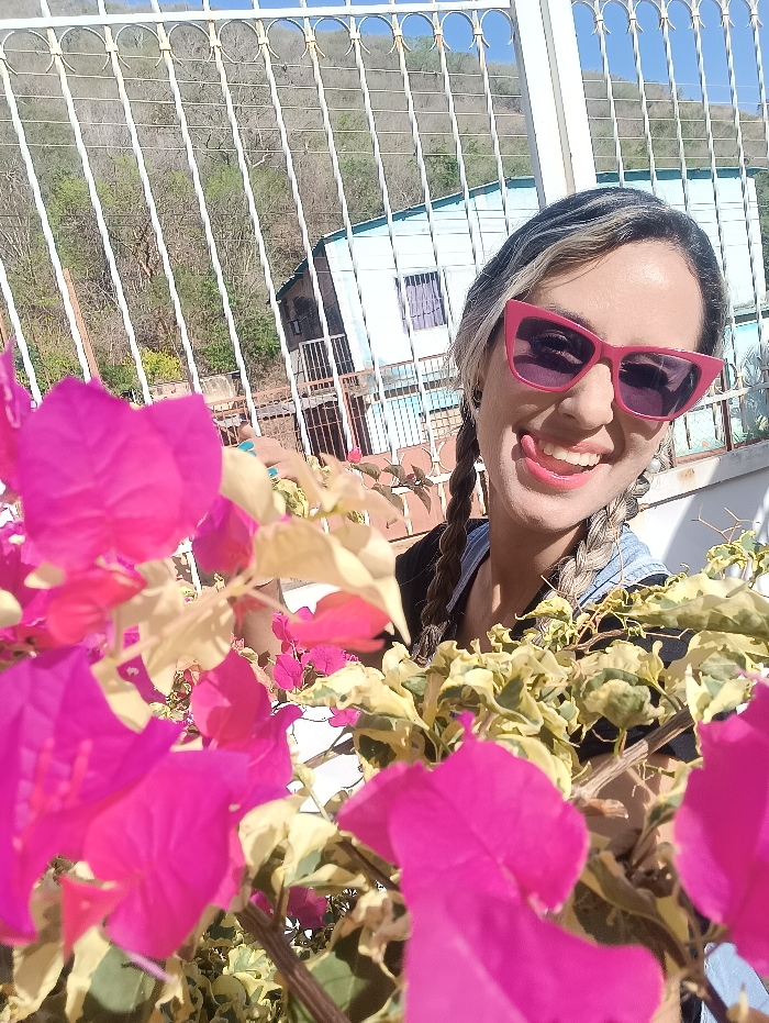 The image captures an outdoor scene in Trapiche del Medio, Venezuela, under a clear, sunny sky. A female subject is positioned in the mid-ground, smiling broadly at the camera with her tongue slightly extended. She wears pink cat-eye sunglasses and has light-colored hair styled in two braids. A black top is visible, along with what appears to be a denim overall strap on her right shoulder. The immediate foreground is dominated by vibrant magenta bougainvillea flowers and variegated green and yellow foliage, partially obscuring the lower half of the subject's face and torso. Behind the subject, a white metal fence with decorative circular elements extends horizontally across the frame. In the background, a light blue two-story building with dark window panes is visible, adjacent to a partially obscured brown structure. A dry, vegetated hillside forms the furthest background element.