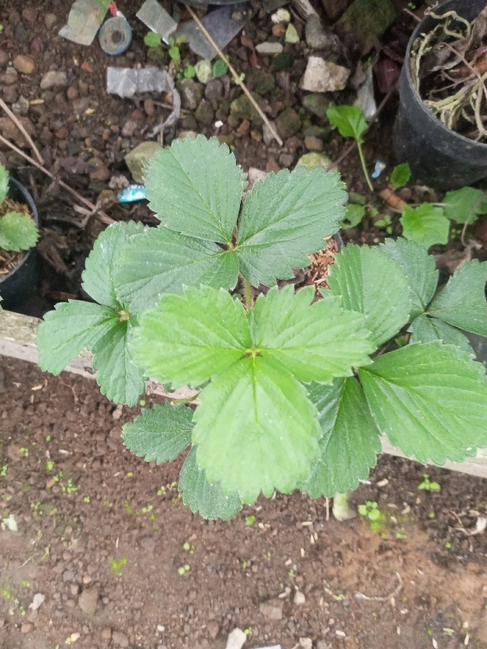 This image depicts a close-up, top-down view of a small cultivation area in Bamhori, India. The primary subject is a cluster of healthy green strawberry plants, characterized by their trifoliate leaves with serrated edges, positioned centrally and towards the bottom of the frame. The plants are growing in dark brown soil, with a partially visible wooden plank or border running horizontally across the mid-ground. In the upper portion of the frame, the ground is composed of loose soil mixed with various debris, including small rocks, crumpled plastic, a blue bottle cap, and dry organic matter. Two black plastic pots are visible; one on the far left contains a smaller plant, and another on the upper right appears mostly empty or contains dried plant material. No people are visible. The scene suggests an outdoor, somewhat untidy gardening or growing environment.