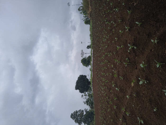A field of young plants, possibly vegetables, stretches across the frame