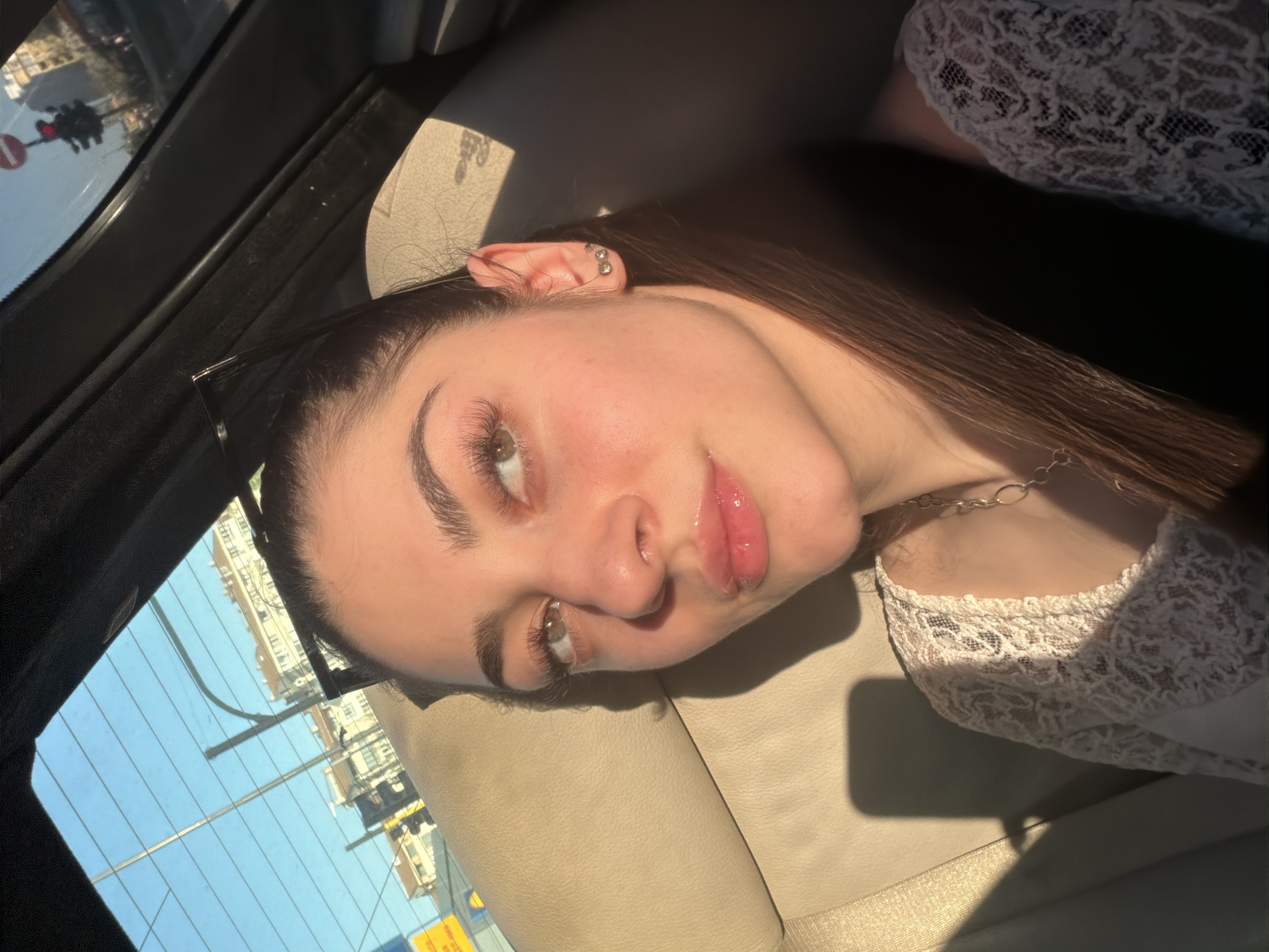 A young woman is taking a selfie from inside a car, presumably while stationary, based on the stopped traffic sign visible through the front window. She is fair-skinned with brown hair and wearing a white lace top. She has multiple ear piercings. The view through the car window shows buildings and blue sky, suggesting daytime in an urban environment. The location is not specified as Sofia, Bulgaria, but the image contains elements consistent with a typical urban setting.