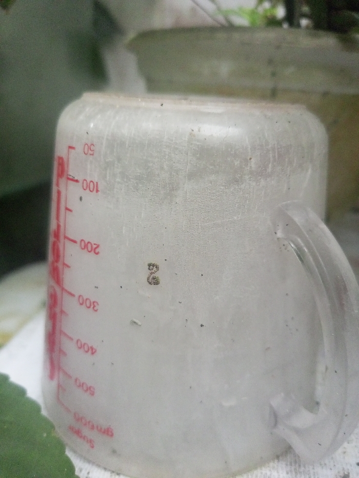 The scene is set in Zee Pin Kone, Myanmar. The primary subject is a worn, translucent white plastic measuring cup positioned in the foreground. The cup features an integral handle on the right side and red volumetric and mass markings on its left side, ranging from 50 mL to 500 mL and indicating "Sugar 600 gm" at the base. The cup's surface exhibits numerous fine scratches, scuff marks, and a scattering of dark particulate matter, consistent with dust or residue. An irregular, approximately 0.5 cm wide, dark-colored particulate accumulation, somewhat resembling the numeral '2' or a squiggle, is adhered to the cup's exterior surface, positioned between the '200' and '300' milliliter markings. In the out-of-focus background, a light-colored, possibly ceramic plant pot is visible, containing indistinct green foliage. A blurred green leaf is partially visible in the bottom-left foreground. No individuals are present, and no actions or interactions are depicted.