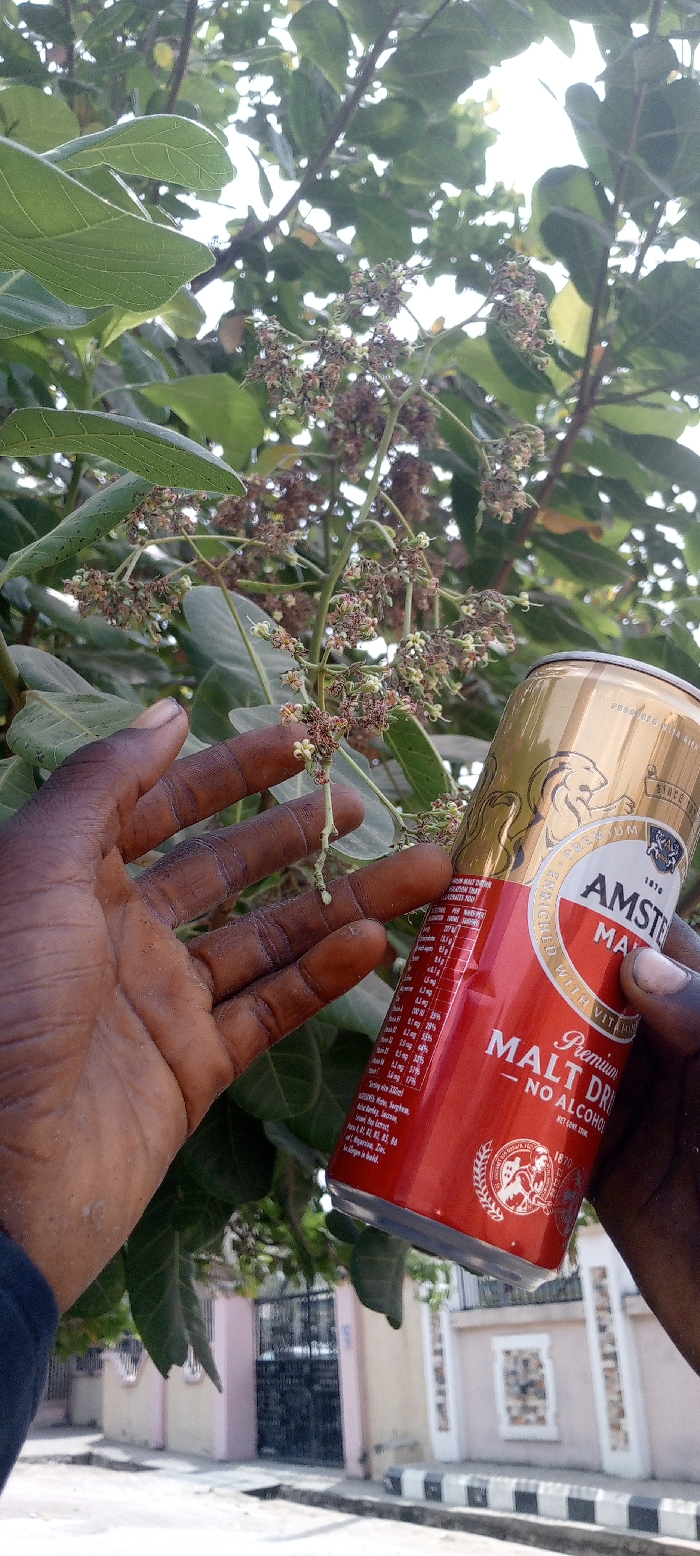 The image displays two dark-skinned hands, presumably belonging to a single individual, in a street environment in Adankolo, Nigeria. The left hand extends towards and appears to interact with a branch of a tree, characterized by green leaves and clusters of small, light-colored flowers or developing fruit. The right hand firmly grasps a red and gold Amstel Malt can, clearly displaying "Premium Malt Drink - No Alcohol" on its label. In the background, a residential street is visible, featuring a light-colored building wall with a black ornate metal gate, and a paved area bordered by a distinct black and white striped curb. The setting appears to be outdoors during daylight hours.