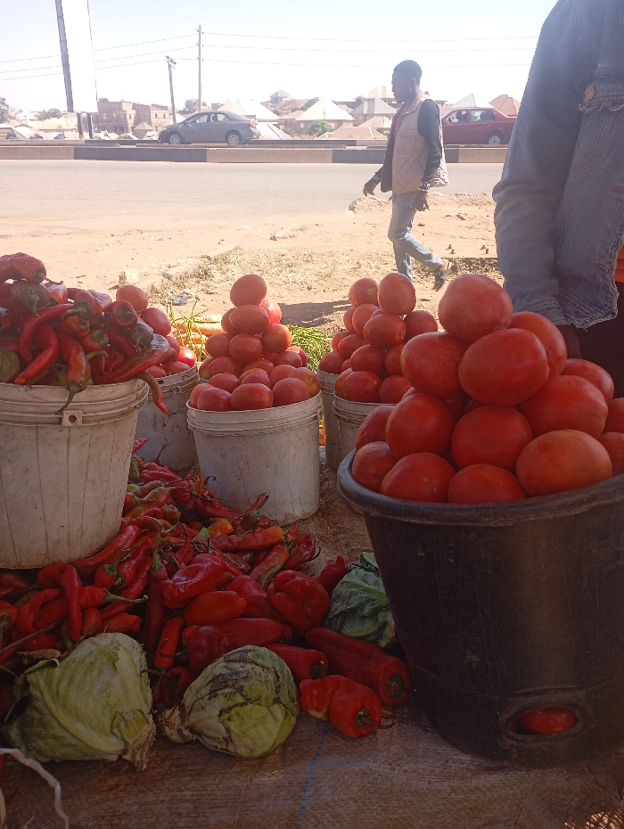 The image displays an outdoor produce market scene situated alongside a road in an urban area of Jos, Nigeria