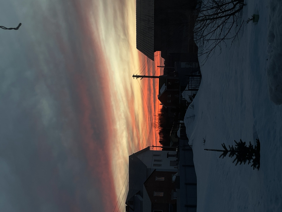 The image depicts a winter residential scene at sunset or sunrise in Ольховка, Russia. The foreground is covered in undisturbed snow with undulating drifts. A small, dark evergreen conifer sapling stands in the central foreground. To the right, a bare-branched deciduous bush or small tree is partially visible, with a small green pot at its base. The midground features several residential buildings: a two-story white house with dark trim and roof on the left, flanked by another dark building, and a dark, silhouetted house with a tiled roof on the right. Dark metal fences and a gate separate the foreground from these properties. A prominent utility pole with multiple power lines runs vertically and horizontally across the midground, heavily silhouetted against the sky. The sky dominates the upper portion of the image, displaying a dramatic array of orange, red, and yellow streaks near the horizon, transitioning to dark grey and blue-grey clouds overhead. A dark line of distant trees or forest is visible on the horizon. No people are present. A dark, irregular object hangs from the upper-right edge, consistent with an interior fixture. The overall scene is static and devoid of active subjects.