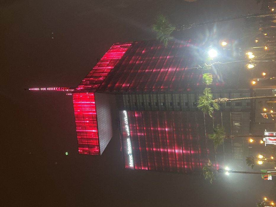 A towering building illuminated in vibrant red light dominates the scene at night. The structure, identified as Maroc Telecom with Arabic script, is adorned with parallel light streaks across its facade. Palm trees line the street, their fronds partly obscuring the illuminated building. Streetlights cast a glow, adding to the bright ambiance.