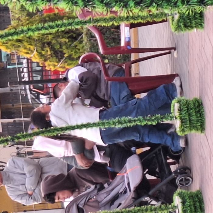 group of people outdoors. A young girl in a white shirt and blue pants is embracing a smaller child who is seated in a red plastic chair. Another person in a pink shirt is behind them. Further back, a person in a grey jacket stands next to an individual wearing a brown hooded sweatshirt who is pushing a baby stroller. The scene appears to be a casual gathering, potentially in a public area. Green garland is draped in the foreground, possibly as decoration.