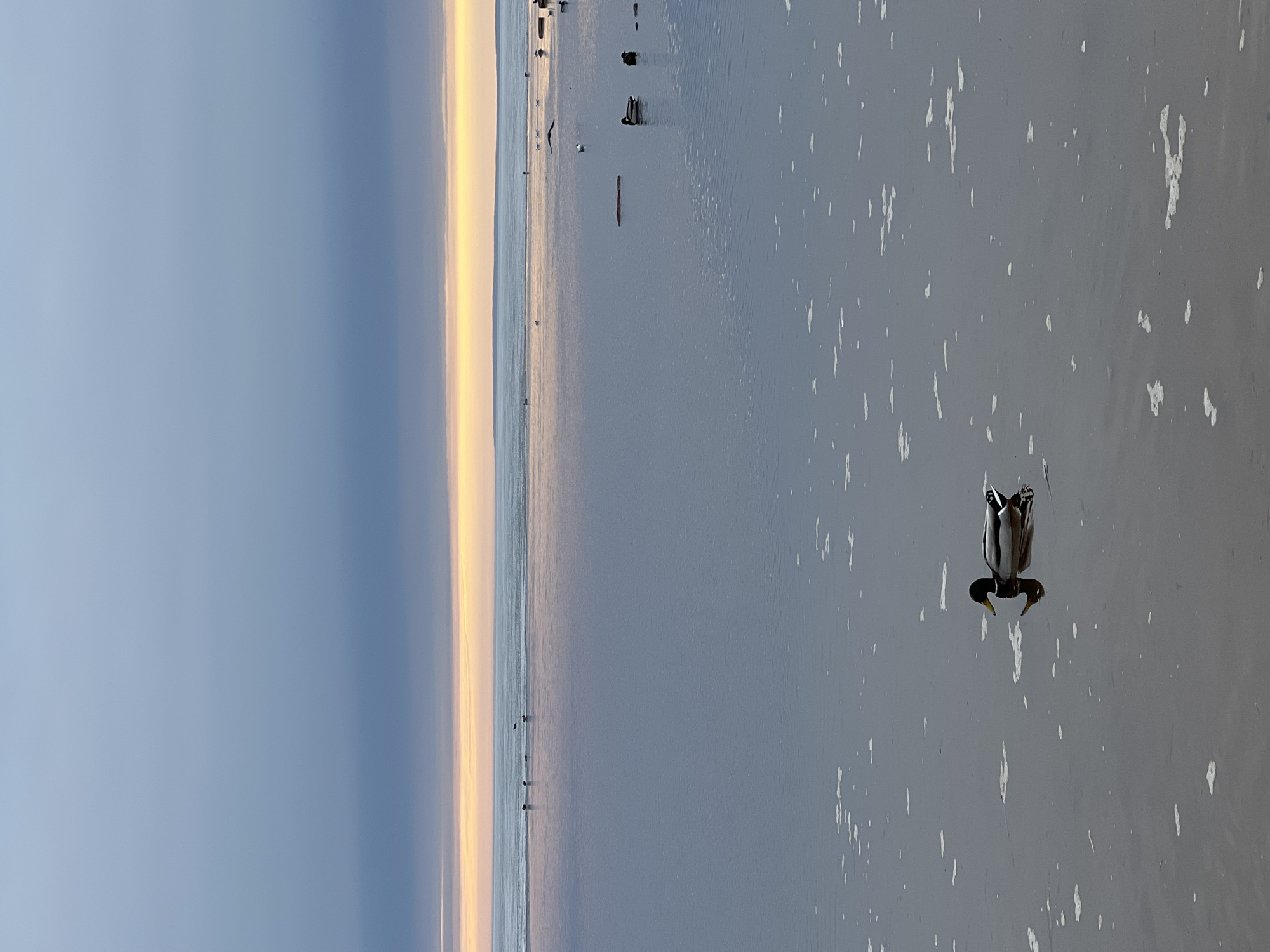 The image depicts a duck swimming in the Gulf of Finland off the coast of Sestroretsk, Russia. The duck is in the lower right portion of the image. The water has some white froth or foam on the surface. In the distance, there is a thin strip of land with a sky that transitions from blue to yellow-orange, indicating either sunrise or sunset. There are also distant objects that might be people or structures visible on the land.