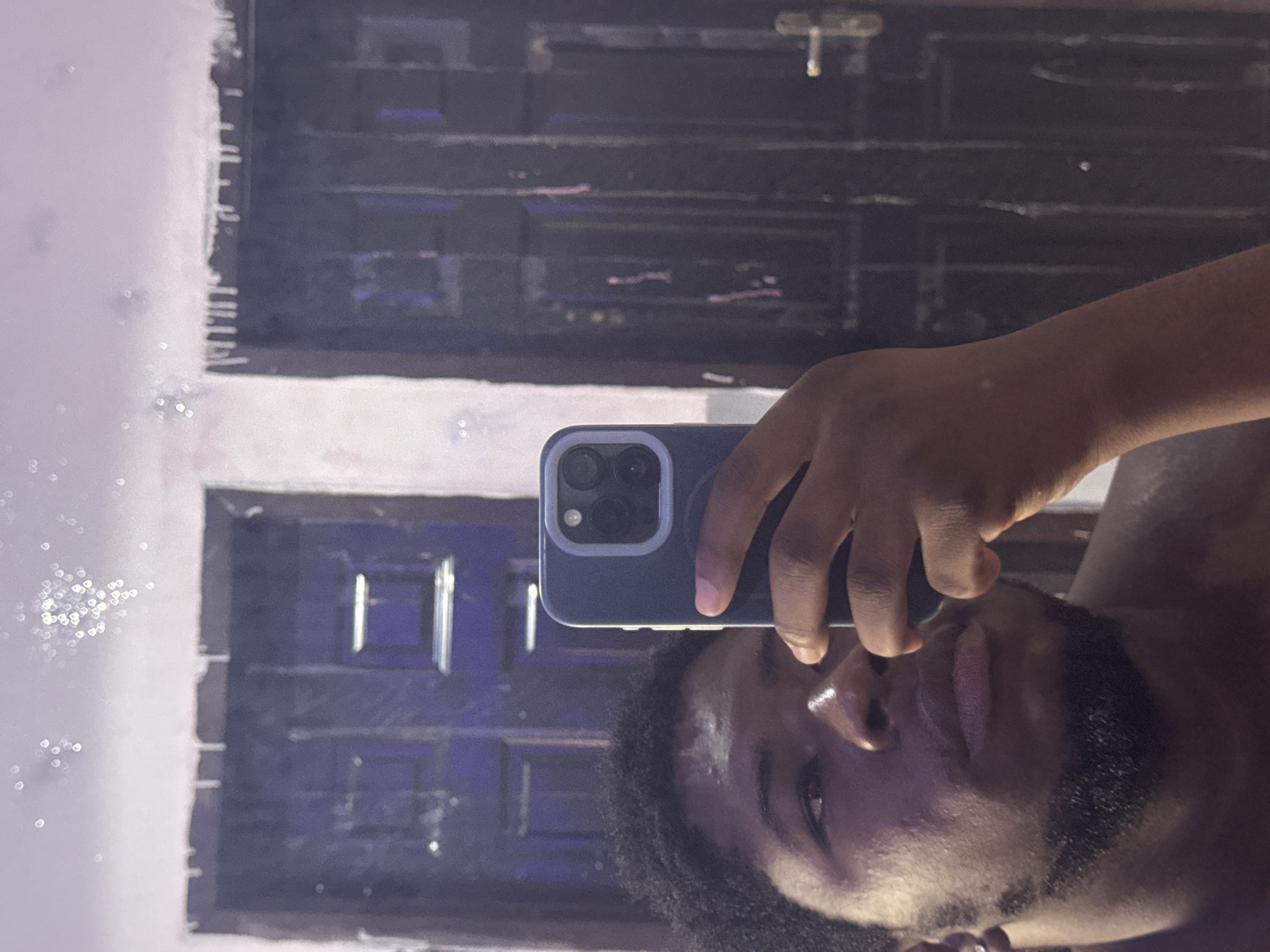 A selfie taken in a mirror with a blue-cased smartphone. The reflected image shows a dark-skinned individual with short, curly hair and a beard. The background features a white wall with speckled lighting and what appears to be a dark, ornate door or cabinet. The location in Ipetumodu, Nigeria is not evident from the image.