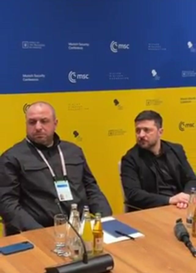 Two men are seated at a wooden table in front of a backdrop that alternates blue and yellow. The man on the left wears a black button-down shirt, a lanyard around his neck, and has a serious expression. To his right is another man, Volodymyr Zelenskyy, who is also dressed in black. Between them on the table are bottles of water and other beverages. Papers, a cell phone, and a microphone are also present. The backdrop is decorated with logos including "Munich Security Conference," "MSC," and "Viktor Pinchuk Foundation."
