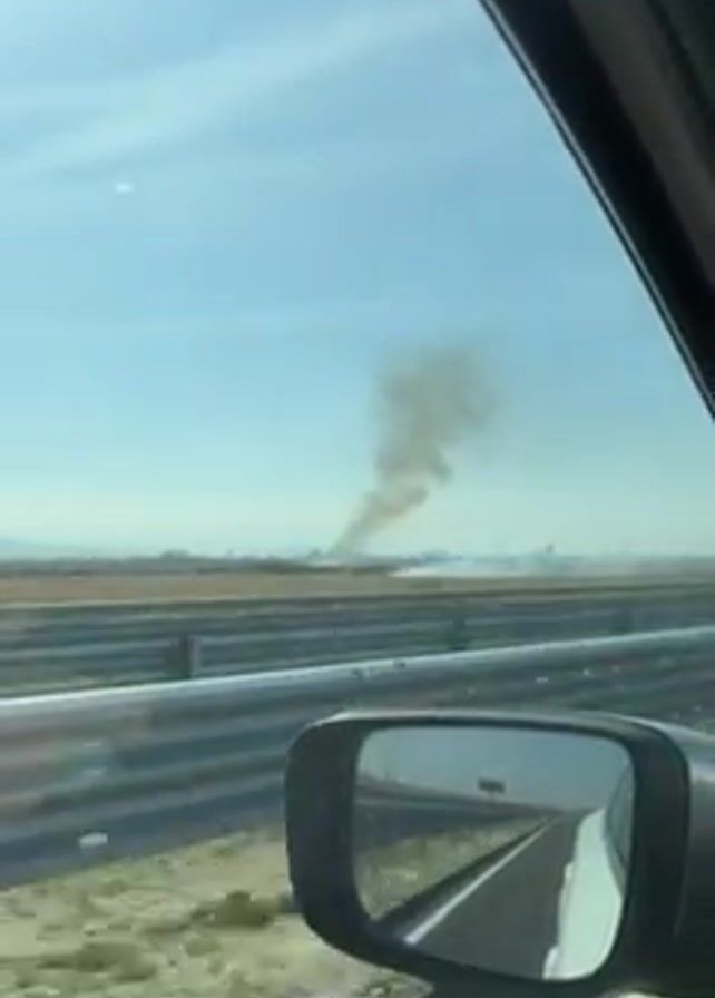 view from the passenger side of a moving car on a highway. The sky is blue with some wispy clouds. A plume of grey smoke rises in the distance, likely from a fire in a field beside the highway. Guardrails run parallel to the road. The car's side mirror is visible in the lower right corner. There is music playing in the background.