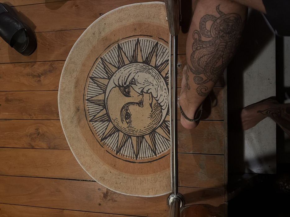 An overhead view captures a scene on a wooden plank floor in Baan Wok Tum, Thailand. A semicircular floor mat, approximately 75cm in diameter, is centrally positioned, displaying a stylized sun and crescent moon design in black outline on a beige-to-light brown background, framed by concentric bands of darker brown. Below the mat, a horizontal, polished metallic bar extends across the frame. A bare human right forearm, featuring an extensive octopus tattoo and a dark braided wristband, rests to the right of the bar. A bare human right foot, also tattooed, is partially visible beneath the forearm, positioned near a lower surface. A partial view of a bare, tattooed human left foot is visible in the lower left quadrant. A single black, platform-soled slide sandal is present on the wooden floor in the upper right corner of the image. No discernible actions or interactions are occurring.