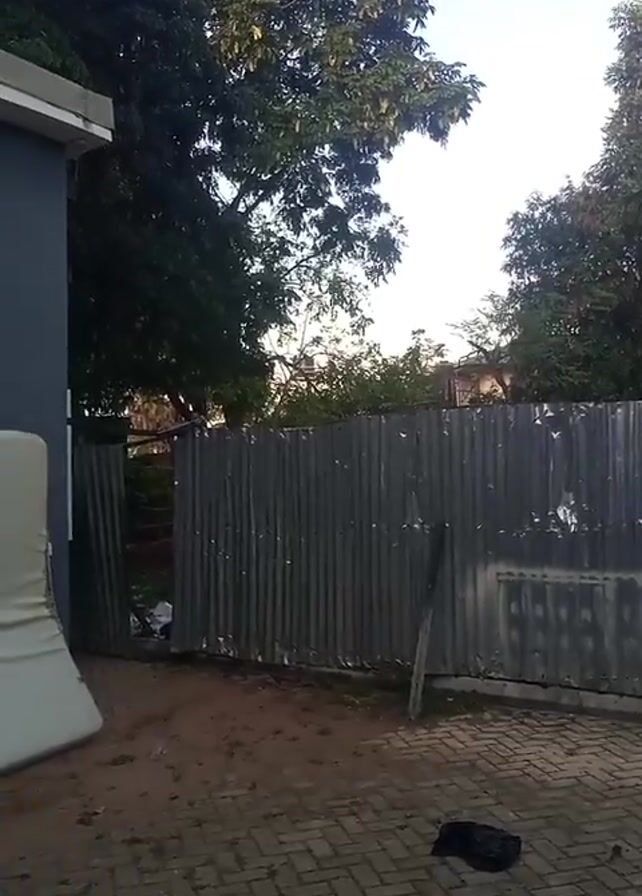The scene is an outdoor area, potentially a backyard or side yard, with a gray building to the left and a corrugated metal fence separating the space from a more overgrown area