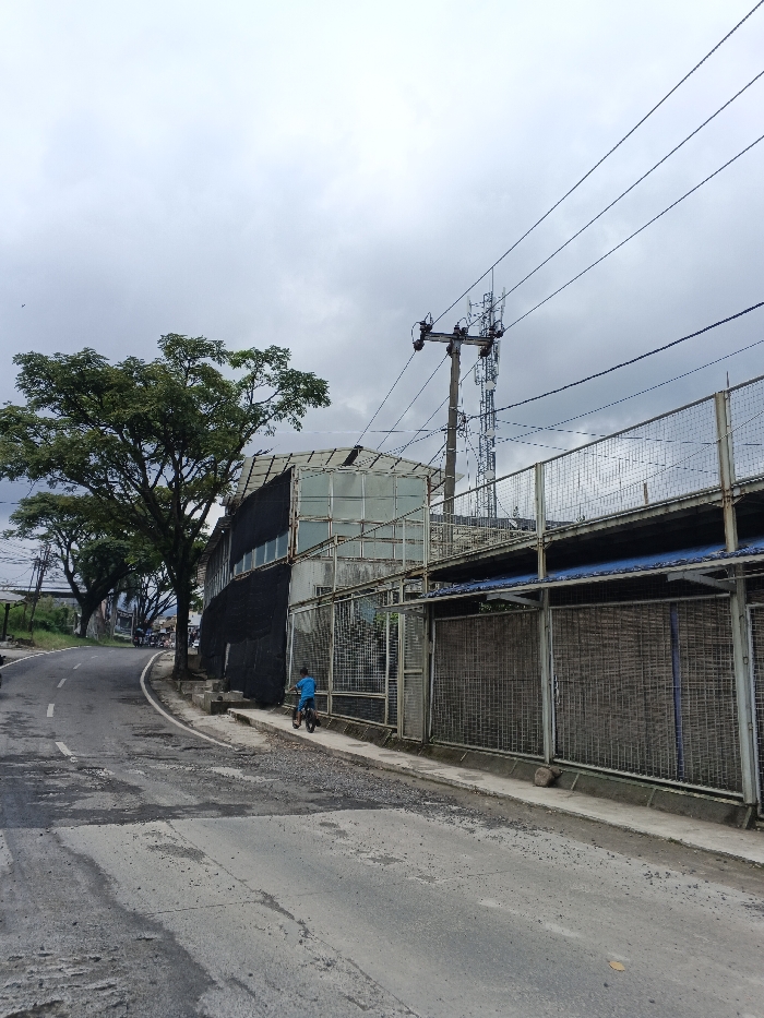 The image depicts a street scene in Dagami, Philippines, under an overcast sky. A patched, two-lane asphalt road, marked with a white dashed line, curves left and ascends into the background. On the right, a concrete sidewalk runs parallel to the road. A young individual, wearing a blue shirt and dark shorts, rides a small bicycle on this sidewalk, moving away from the viewer. Adjacent to the sidewalk on the right is a multi-story building. Its upper section features light-colored panels or windows, while the lower portion is dark, possibly covered with black material. To the right of this building, a structure enclosed by metal mesh fencing with a framework is visible. This fenced area includes an elevated platform or second level, also enclosed by mesh. Below the elevated section, a blue awning extends over a lower fence line composed of woven, light brown material. In the mid-ground on the right, a wooden utility pole supports multiple cross arms and numerous overhead wires that traverse the frame. Behind this pole, a tall, slender cellular or radio transmission tower is visible. On the left side of the road, several large, deciduous trees with dense green foliage line the ascending curve of the street.