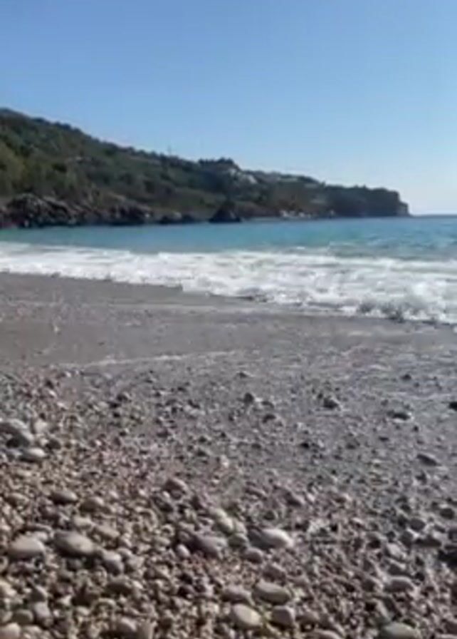 A daytime exterior shot depicts a wave of water breaking on a pebbled beach. The camera is aimed toward the ocean, and the wave rushes up the beach toward the camera. The water is turquoise, and the sky is a clear blue. The beach itself is covered in grey and brown pebbles. A cliff covered in greenery juts out into the ocean in the background. A white building is visible on the cliff.