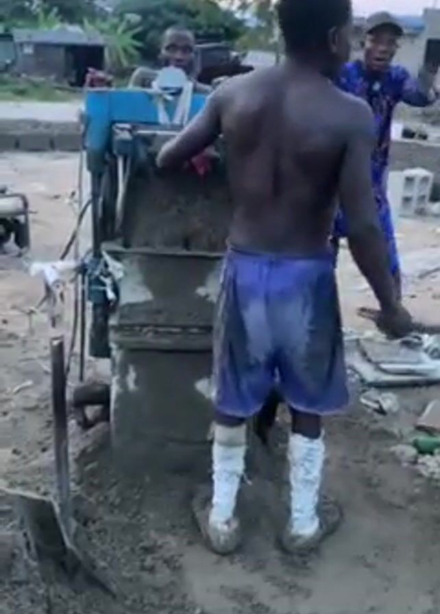The video depicts three men working around a cement mixer in an outdoor setting. One man, shirtless and wearing blue shorts and white socks, is actively tending to the mixer, seemingly loading or adjusting the mixture inside. Another man, wearing a blue and red patterned shirt, gestures animatedly, possibly giving instructions or commenting on the process. A third man is partially visible behind the cement mixer. The mixer itself is a light blue, industrial-looking machine, and the surrounding ground is covered in dirt and cement residue. A shovel is stuck into the ground, and some building materials, like concrete blocks, are also visible nearby. The setting appears to be a construction or work site in what seems to be a populated area, with houses and trees visible in the background.