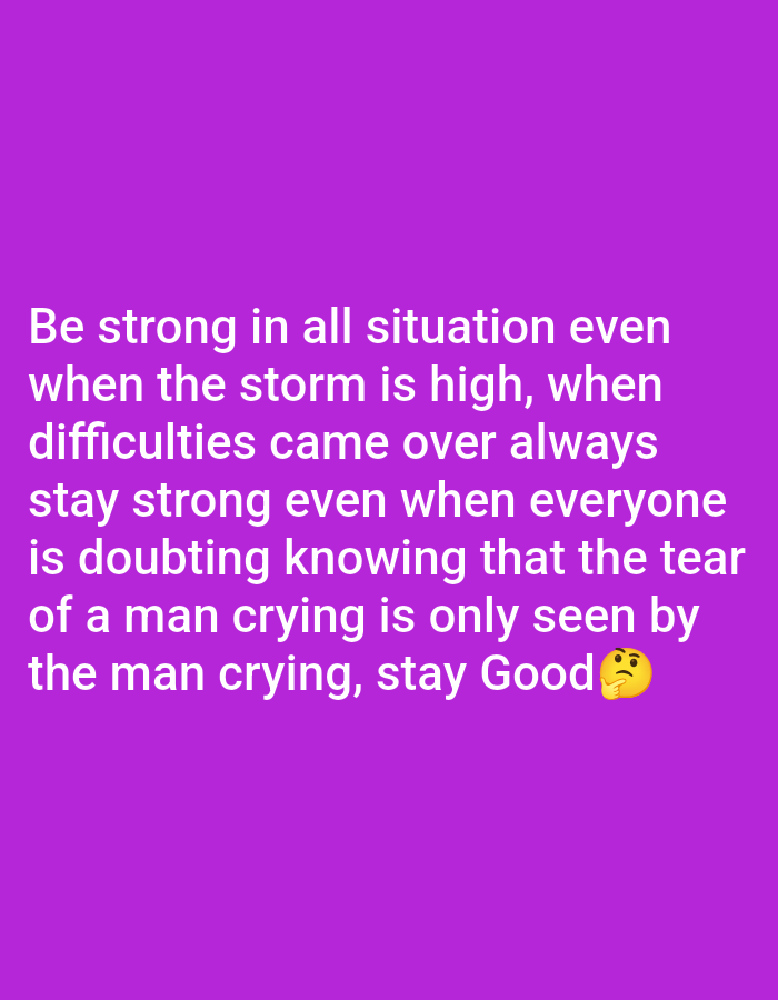 This image is a digital graphic featuring white text against a solid purple background. The text reads: "Be strong in all situation even when the storm is high, when difficulties came over always stay strong even when everyone is doubting knowing that the tear of a man crying is only seen by the man crying, stay Good 🤔". A "thinking face" emoji is appended at the end of the text. No discernible people, subjects, objects, actions, or interactions are depicted beyond the text and its background. This image does not represent a physical scene or location within the city of Ogbomosho, Nigeria, or anywhere else.