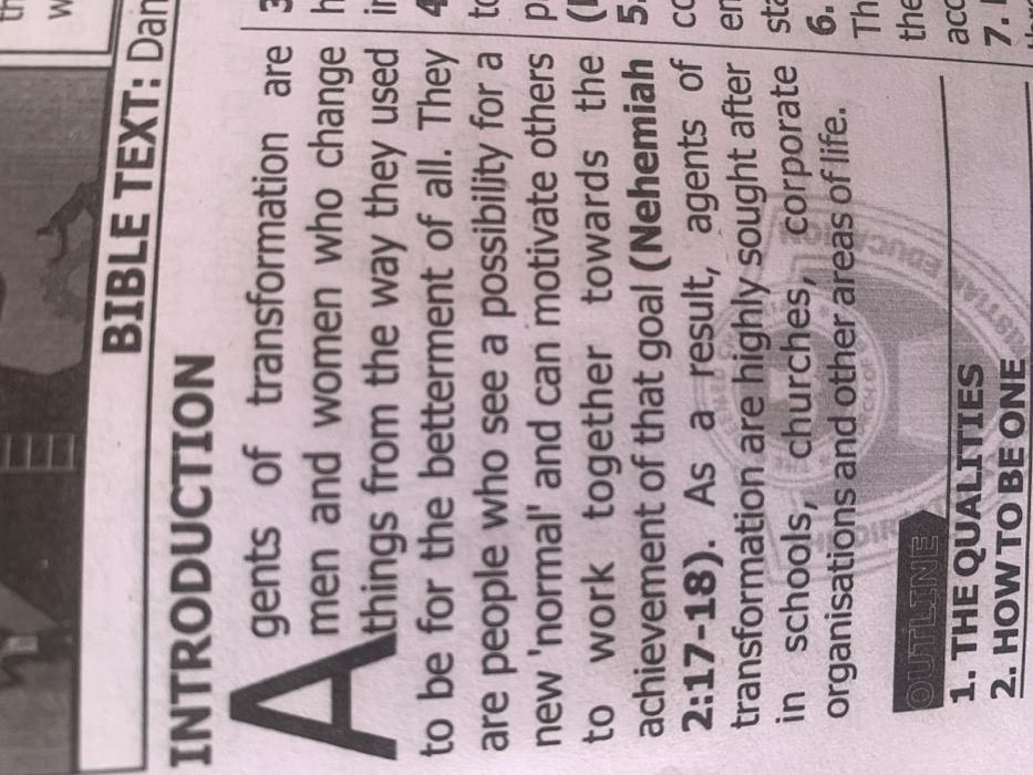 The scene depicts a close-up view of a printed page from a document, located in the city of Kurudu, Nigeria. The page features black text on a light background, with some grayscale imagery. A header at the top right states "BIBLE TEXT: Dan". Below this, a section titled "INTRODUCTION" begins with a large capital 'A', followed by text defining "agents of transformation" and citing "Nehemiah 2:17-18". A blurry grayscale image, possibly depicting a figure near a ladder, is visible in the upper portion of the page, partially above the "INTRODUCTION" title. A circular watermark, partially obscured by the main text, is discernible in the lower half of the page, displaying text fragments such as "CHRISTIAN EDUCATION" and "CHURCH OF GOD". Below the main text, an "OUTLINE" section lists "1. THE QUALITIES" and "2. HOW TO BE ONE". A column on the right side of the page shows fragmented numbered text entries, including numbers 3 through 7. No people are visible, and no actions or interactions are depicted.