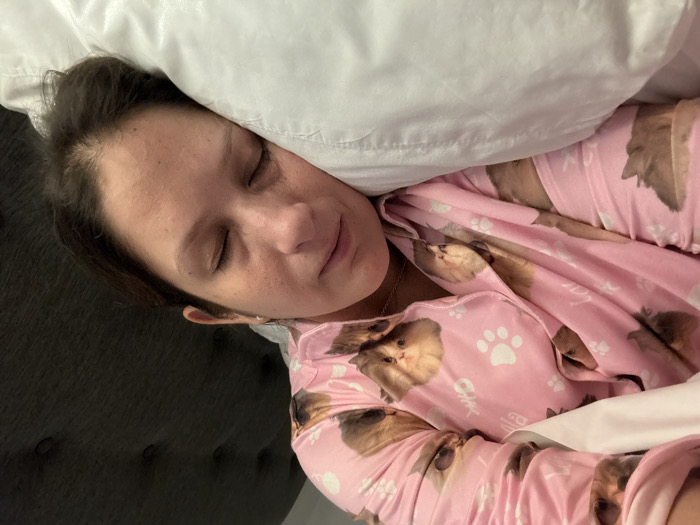 A female subject is depicted lying on her right side, asleep, on a bed in a bedroom located in San Isidro, Peru. Her eyes are closed, and her head rests on a white pillow. She is dressed in pink pajamas adorned with patterns of cat faces, paw prints, and fish skeletons. A white sheet or blanket covers a portion of her body. In the background, a dark gray upholstered headboard with visible button tufting is present.