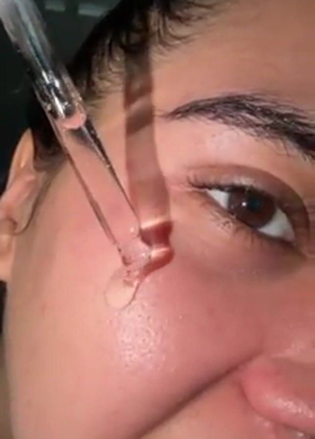 A close-up shot shows a smiling woman applying a clear liquid serum to her face using a dropper