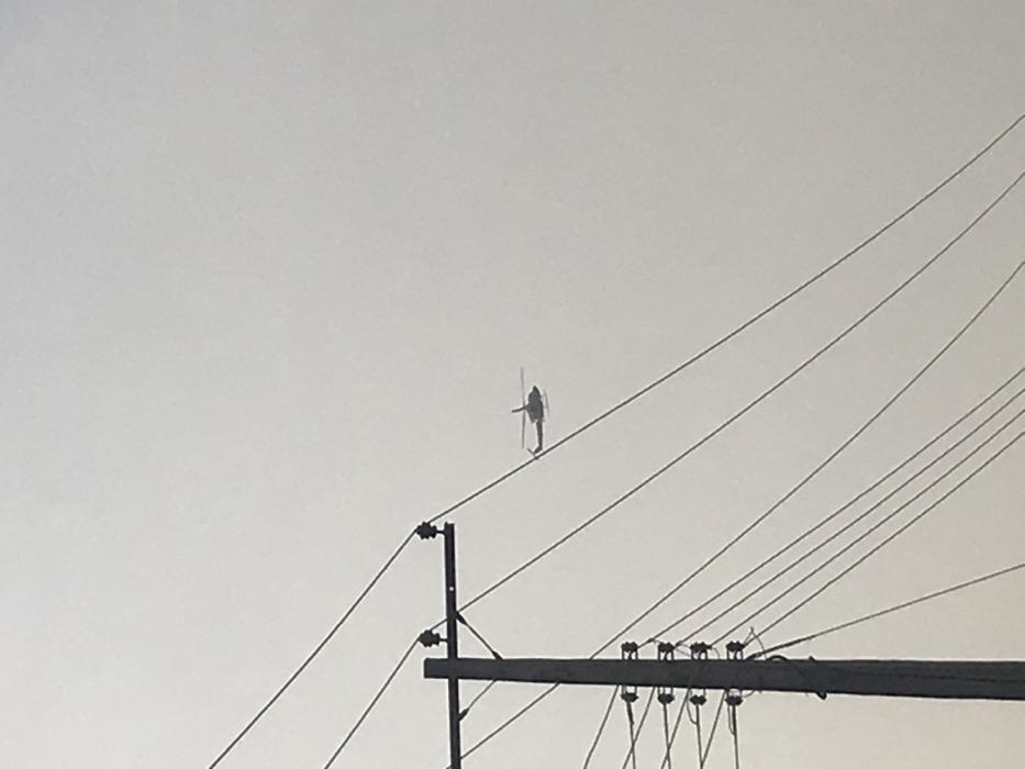 An outdoor scene in Lokoja, Nigeria, displays a dark utility pole positioned vertically on the left side of the frame, supporting multiple horizontal cross-arms with numerous power lines and cables running diagonally and horizontally across the image. The background consists of a uniformly light grey, hazy sky. In the mid-ground, a helicopter is visible in silhouette, flying horizontally from right to left. Its main rotor blades, tail boom, and tail rotor are discernible. No individuals are present in the image. The environment suggests an urban or semi-urban setting with visible electrical infrastructure.