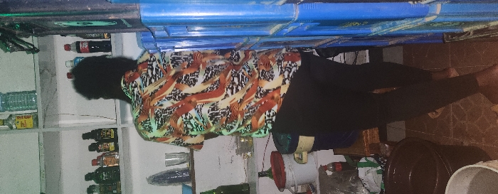 A person in a patterned shirt and dark pants is standing in a room. Behind the person is a shelf with bottles of various liquids. Above the person is a blue structure. To the right of the person are various containers and objects. The location is Kabong, Nigeria.