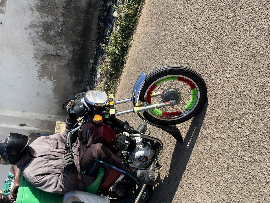 An individual operates a maroon "Boxer" motorcycle on a paved road in Gura Top, Nigeria, during daylight hours