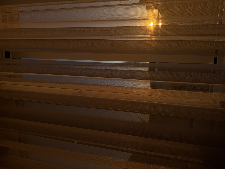 The image displays an interior perspective looking through a window in Rafailovići, Montenegro. The window is largely obscured by numerous vertical panels of translucent, light-brown or beige sheer curtains, which are illuminated from behind by a strong external light source. These curtains exhibit a warm, orange-brown coloration, with visible fabric texture and vertical folds covering most of the frame. A narrow, vertical opening is present between curtain panels in the central portion of the image, offering a clearer view of the exterior. Through this gap and the translucent curtains, the sky is visible, transitioning from a pale blue at the top-center to an intense orange-yellow hue towards the lower right. A distinct, bright orange-yellow circular light source, consistent with the sun, is situated in the lower right quadrant, partially obscured by distant building silhouettes and the curtain material, generating noticeable lens flare. Indistinct, dark architectural outlines are faintly discernible against the brightly lit sky on either side of the central curtain opening. No individuals, animals, or specific interior objects are present or identifiable in the scene.