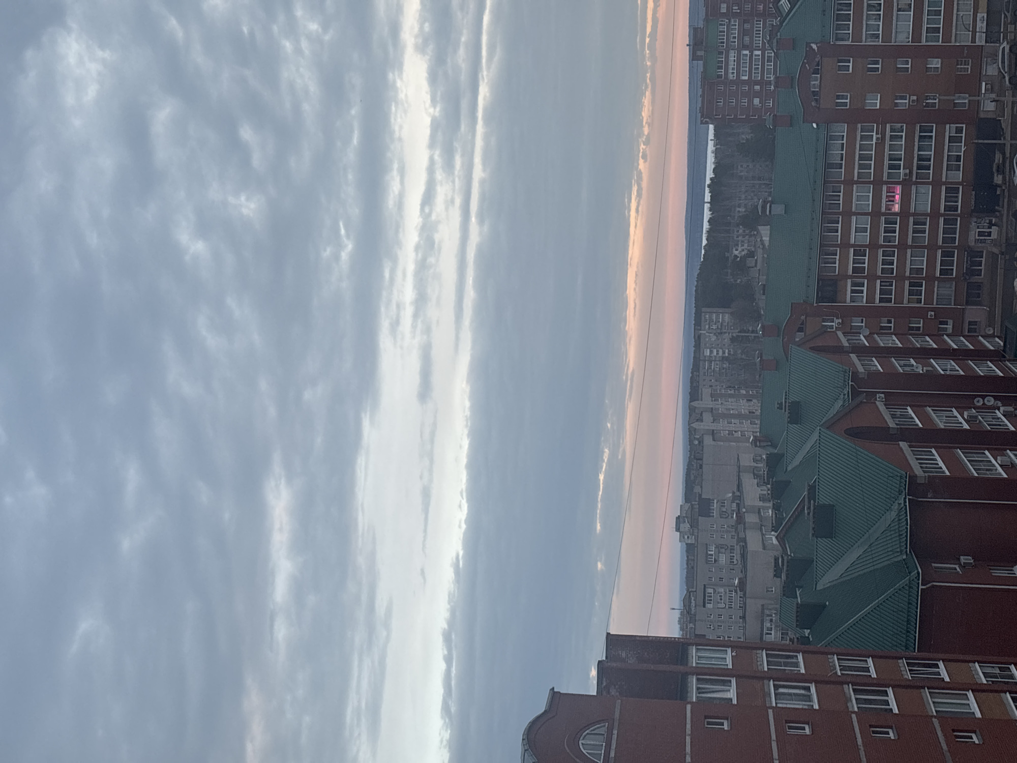 n urban landscape under a cloudy sky, likely at sunset or sunrise, given the soft pinkish-orange hues on the horizon