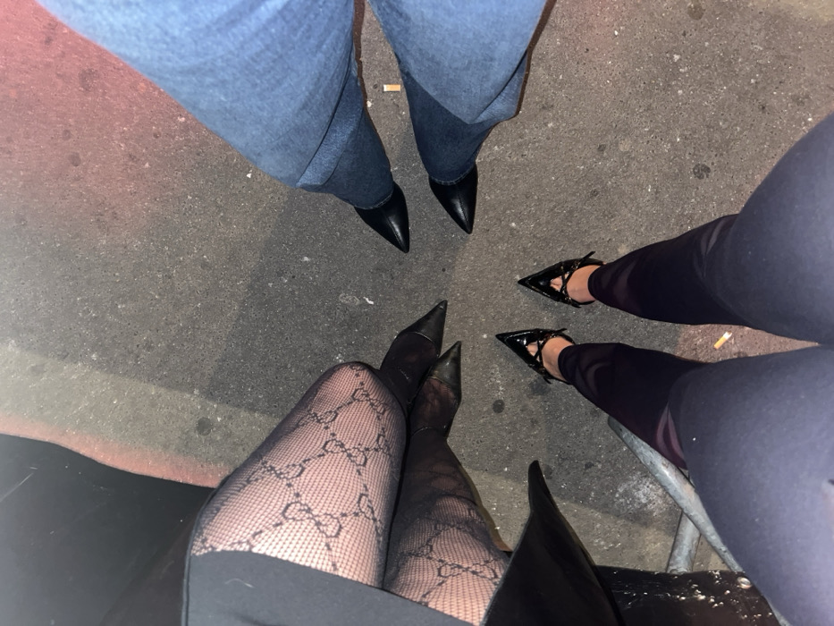 A low-angle shot of three people standing close together. One wears light denim jeans and pointy black shoes. Another wears dark leggings and pointy black shoes with straps. The third wears a black skirt, patterned fishnet stockings, and pointy black shoes. The ground is concrete with some staining and a cigarette butt is visible. The perspective is from above.