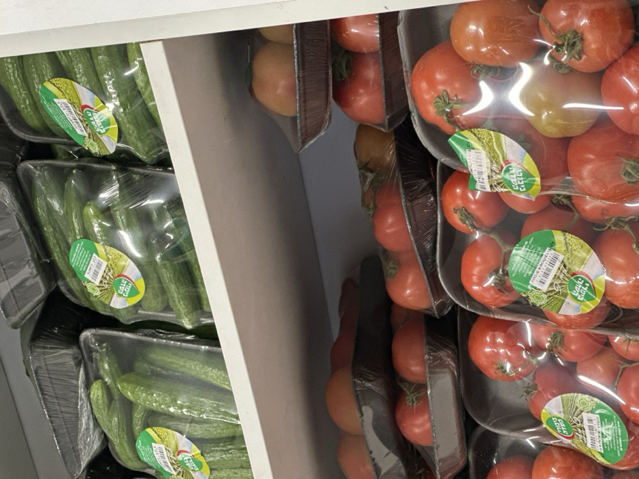 Packaged cucumbers and tomatoes are arranged side by side on shelves