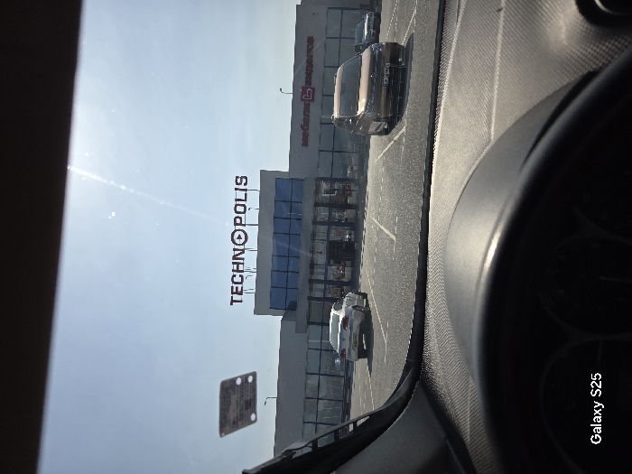 The image provides a view from inside a vehicle, looking forward through the windshield at a commercial building identified as "TECHNOPOLIS" by prominent red lettering on its facade
