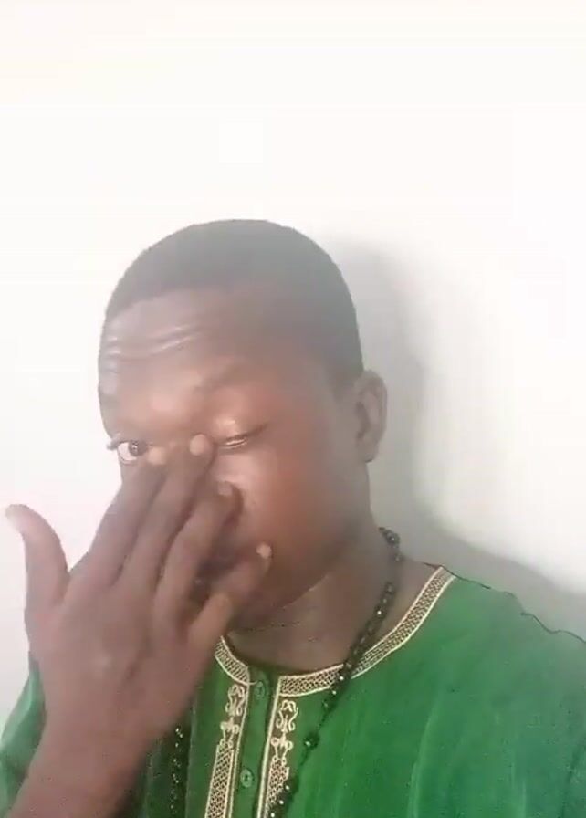 A man is standing in front of a white wall. He is wearing a green shirt with gold trim and a black beaded necklace. He has a somber expression and is looking directly at the camera. There is some glistening on his cheek, possibly tears. He makes a gesture with his hand, touching his nose with his finger and thumb.
