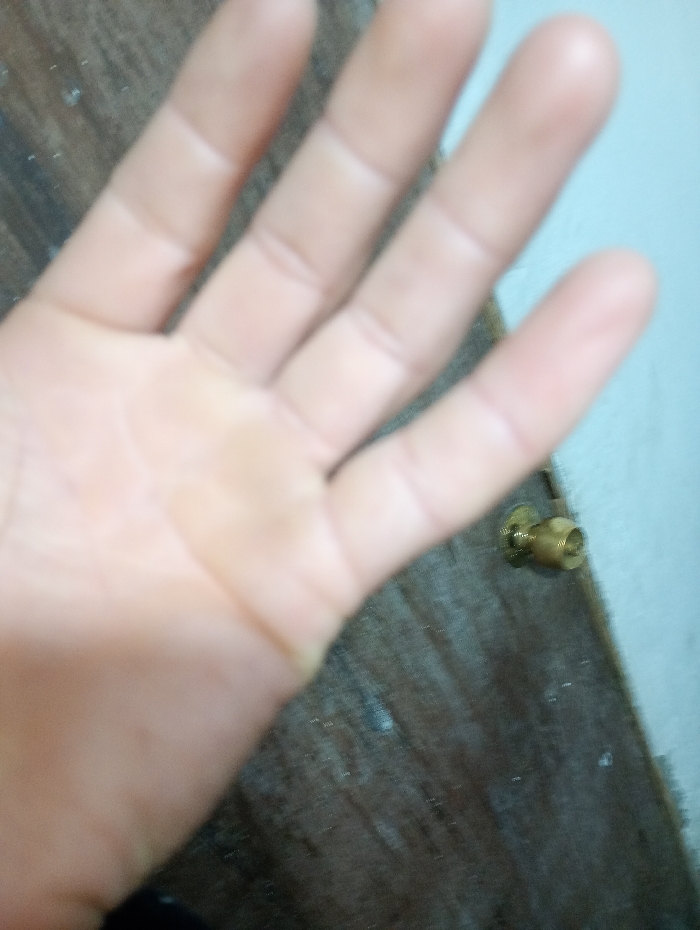 close-up view of an outstretched right hand, palm facing the camera. The hand is out of focus, with only the fingers and palm visible. The hand is positioned against a backdrop of wood-grain flooring and a white wall. A small, out-of-focus brass fitting is located in the top right corner of the image, near the wall. The image was taken in Tlalnepantla, Mexico, at the coordinates 19.549 latitude, -99.117 longitude. The environment appears to be an indoor, domestic setting. No other people or objects are visible in the image.
