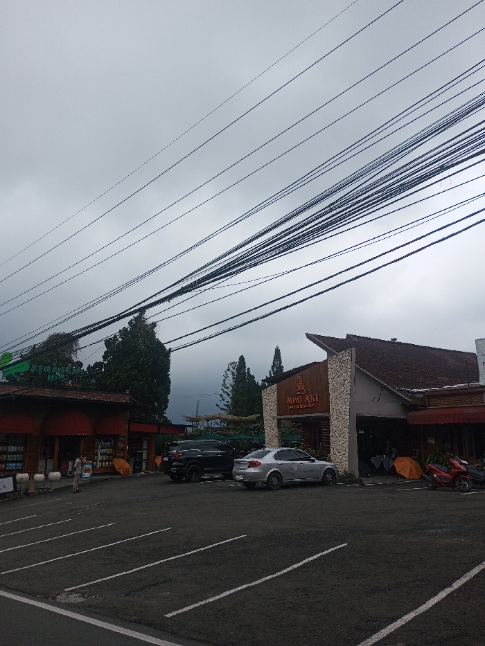 A cloudy sky hangs over a parking lot in front of two buildings. The building on the right, "BUMI AKI", features a wooden facade. Cars and motorcycles are parked in the lot. Power lines dominate the upper portion of the image. An orange umbrella is visible near the "BUMI AKI" building. A person stands near the building on the left.