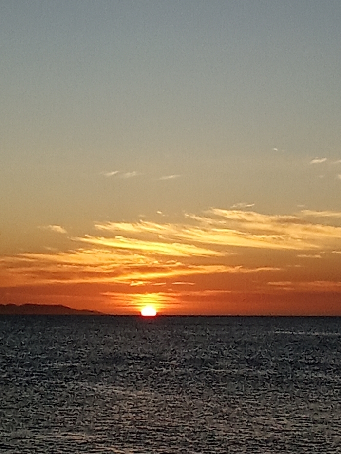 The image displays a sunset over the ocean in Juan Griego, Venezuela. The setting sun, a vivid orange-yellow segment, is positioned just above the horizon, illuminating the sky. The sky transitions from deep orange and red at the horizon, through shades of yellow and lighter orange, to a pale blue-grey at the top. Elongated, wispy clouds, highlighted in yellow and orange, are visible across the mid-section of the sky. The lower half of the image is occupied by the dark blue-grey ocean, its surface textured with small ripples. A dark, low-lying landmass is silhouetted against the bright horizon on the far left. No individuals, animals, or man-made structures are present within the frame.