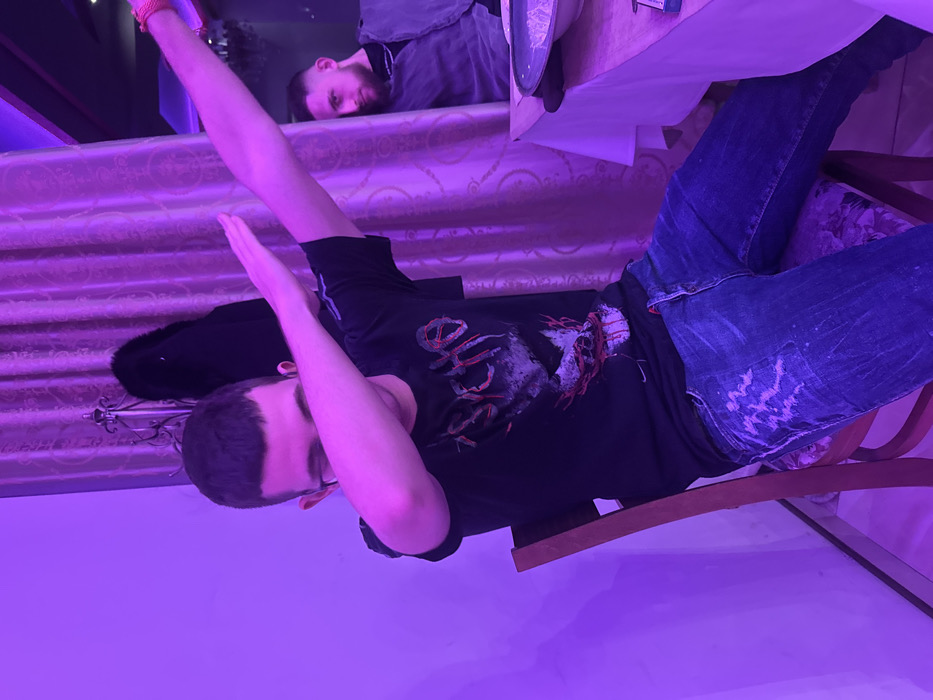 The image depicts an indoor scene within a commercial establishment, likely a restaurant or bar, located in Radievo, Bulgaria. The environment is dominated by strong purple ambient lighting. In the foreground, a male subject with short, dark hair and eyeglasses is seated on a wooden chair featuring a patterned upholstered seat. He is wearing a dark t-shirt with a graphic design that includes the word "PSYCHO" and a macabre illustration, along with blue jeans exhibiting distressed, lighter patches. This individual is performing a "dab" gesture, with his right arm extended upwards and to the right, while his left forearm is bent and positioned horizontally across his upper face, obscuring his eyes. A pink or red band or bracelet is visible on his right wrist. To the right and in the mid-ground, a second male subject with short, dark hair and a beard is partially visible. He is seated at a table covered with a white tablecloth, wearing a dark jacket or vest over a dark shirt, and is looking directly towards the camera with a focused expression. On the table, a dark plate, a white bowl, and a small white packet are present. The background consists primarily of patterned curtains illuminated by the purple light. Behind these curtains, an ornate metallic coat rack with a dark coat draped over it is discernible. A plain, light-colored wall, also suffused with purple light, is visible to the left of the foreground subject.