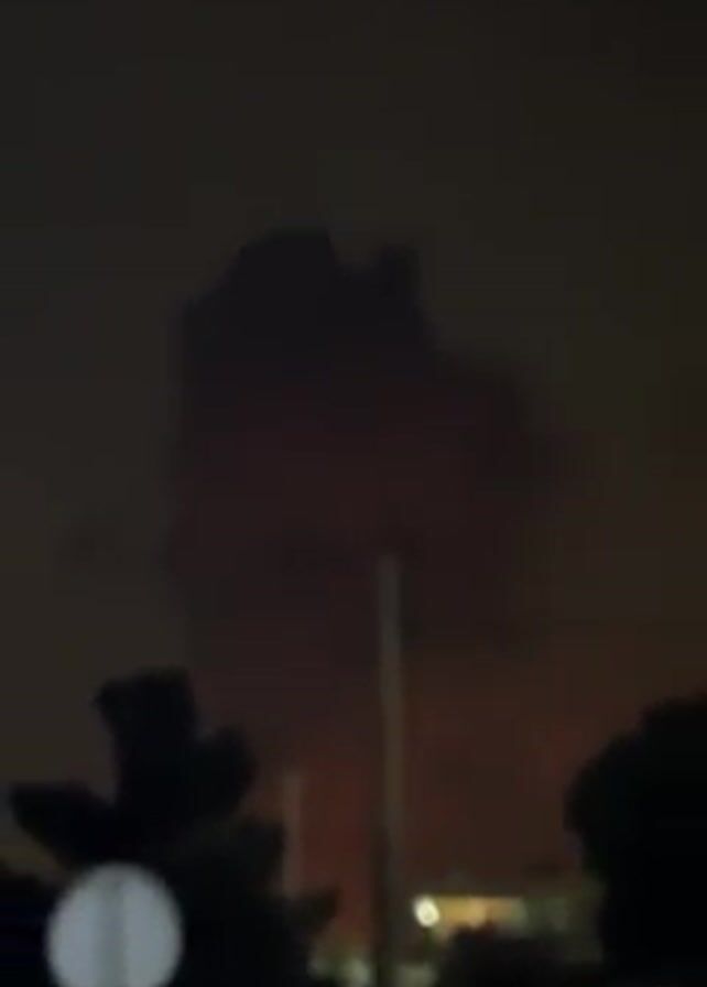 large cloud of dark smoke in the sky at night. The sky is dark, with a slight orange glow visible behind the smoke. In the foreground, there is a fence, trees, and a street light. A building is visible in the distance. The camera appears to be handheld and slightly shaky.
