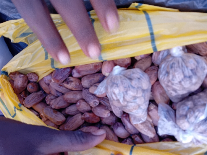 A yellow plastic bag is filled with dates, some loose and some in clear plastic bags. A hand is visible at the top and bottom of the image, holding the bag open. The dates are brown and oval-shaped. Some dates appear shriveled. The clear bags contain smaller, round items that are likely dates or date-related products.