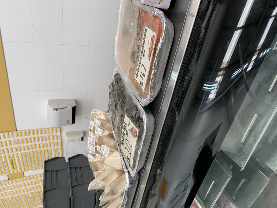 A close-up shot features an array of products on a shelf, likely within a store. These items include trays of wrapped fruits, some labeled with prices; one mentions "FRUTA SECA CRISTALIZADA $162 KG", while another mentions "HIGO EN MIEL $212 KG". In the background, a set of bins and rolls of price labels and a wall-mounted dispenser are visible, adding to the supermarket setting. Reflected in the adjacent glass is the interior of the store.