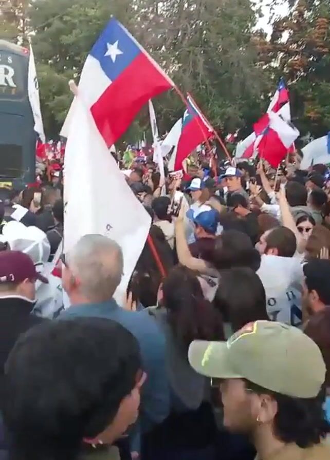 A large crowd of people is gathered, waving Chilean flags. There are also white flags present in the crowd. Many people are holding up their phones, seemingly taking pictures or videos. A bus with "JOHANNES KAISER PRESIDENTE" written on it is parked near a stage. The scene appears to be an outdoor rally or political event. The environment suggests a park-like setting with trees in the background. The sky is a light shade, indicating either early morning or late afternoon.