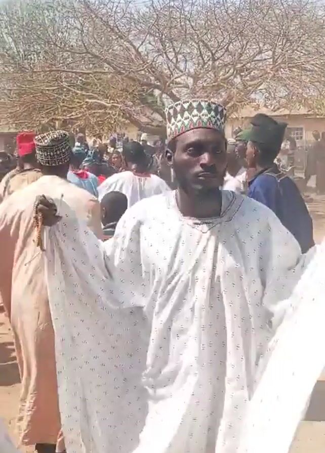 man in a white patterned robe and a colorful traditional hat standing amongst a crowd of people. He is holding what appears to be prayer beads. He is the focus of the video, and he looks directly at the camera for the majority of the recording. The crowd consists mostly of men, some of whom are wearing traditional clothing. In the background, there are bare trees and buildings. The scene seems to be outdoors on a sunny day.