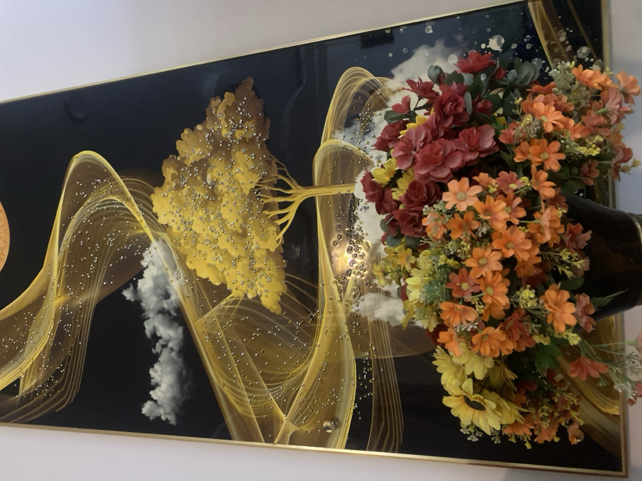 A framed artwork depicts a black background with golden, flowing lines. A stylized golden tree, adorned with small silver dots, stands amidst clouds. A branch-like extension connects the tree to a vibrant arrangement of flowers in shades of red, orange, and yellow, appearing to cascade from a vase. The artwork's style blends abstract and floral elements.