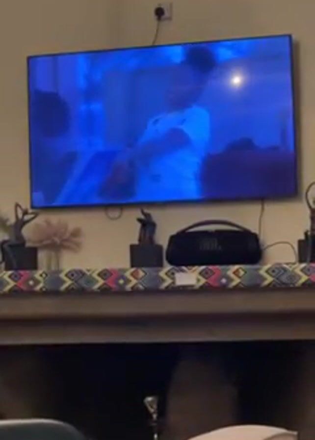 A medium shot shows a flat-screen television mounted on a light-colored wall