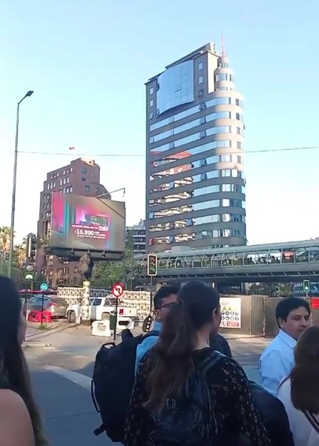 group of people waiting at a crosswalk in a city. Behind them are a tall, modern building with reflective windows, a pedestrian overpass, and another building with a large digital billboard. The sky is clear and blue. The people appear to be a mix of ages and are dressed in casual clothing. They are mostly facing away from the camera, seemingly waiting for the light to change. Some are talking to each other, while others are looking at their phones. There are several vehicles visible in the background.