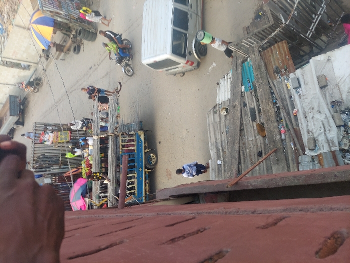 An elevated view shows a bustling street scene. Vehicles including a van and trucks, one with a blue and yellow striped covering, navigate the road. Several individuals are walking, riding a motorcycle, or standing around a truck filled with what appears to be building materials. The scene transitions from a paved street to corrugated metal roofs cluttered with debris. The foreground is dominated by a red-brown surface with linear indentations.