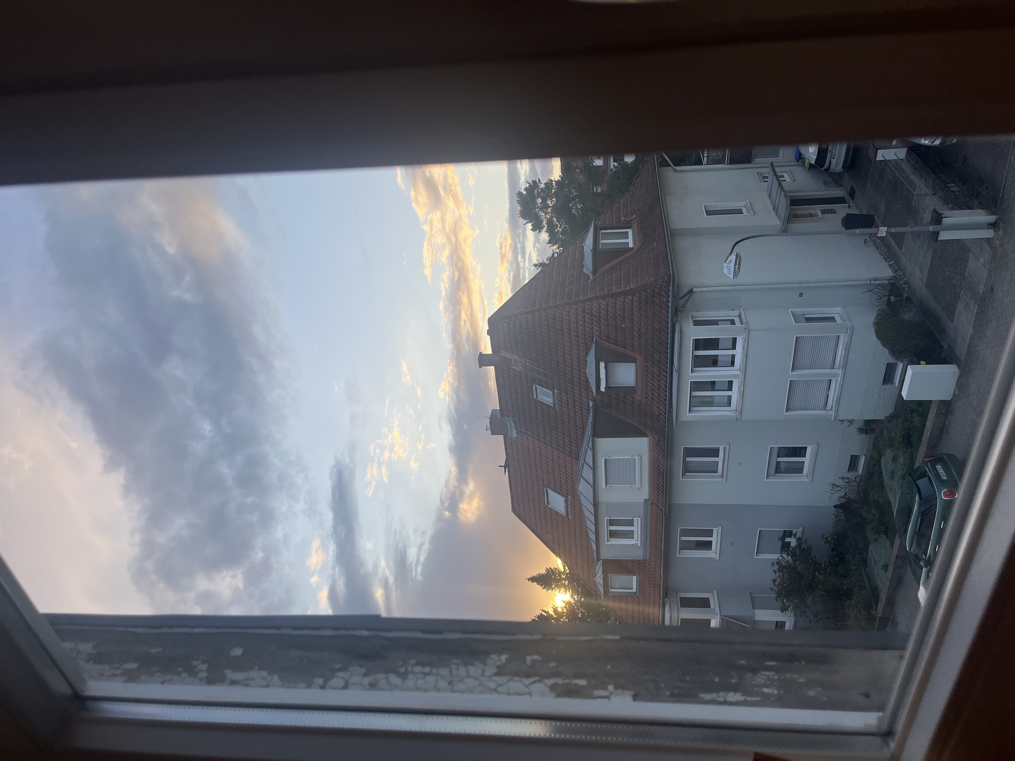 The image depicts an exterior scene viewed through a window frame, revealing a residential area in Saarbrücken, Germany, at dusk. The sky occupies the upper portion, displaying a mix of blue, grey, and orange-pink clouds illuminated by the setting sun, which casts bright rays through a cluster of coniferous trees on the left horizon. The primary subject is a multi-story residential building with a light grey facade and a prominent red-tiled pitched roof featuring several dormer windows, some fitted with closed white roller shutters. White-framed windows are visible across the building's stories. A small, legible blue sign is affixed to the right corner of the building's first floor. In front of the building, a paved driveway leads to an entrance with a small canopy. A dark potted plant stands near the entrance. A dark green Mini Cooper, bearing the German license plate "SB K 517" (indicating Saarbrücken), is parked in a lower driveway area on the left. A white SUV is partially visible, parked nearer the building's main entrance on the right. Another vehicle, silver or grey, is minimally visible on the far right. A modern street lamp post with a flat luminaire head stands near the center-right foreground, adjacent to a dark grey garbage bin. Sparse green vegetation, including small bushes and ground cover, is present in landscaped areas surrounding the driveways and buildings. The window frame on the left shows signs of wear, with peeling paint or grime. No individuals are visible within the scene.
